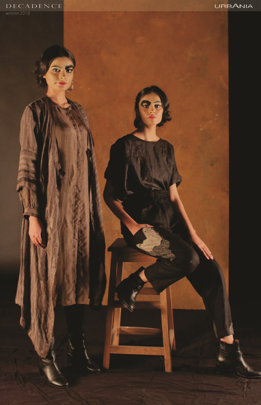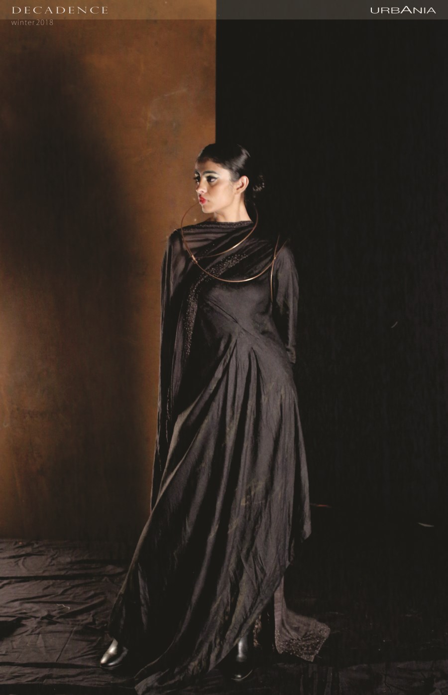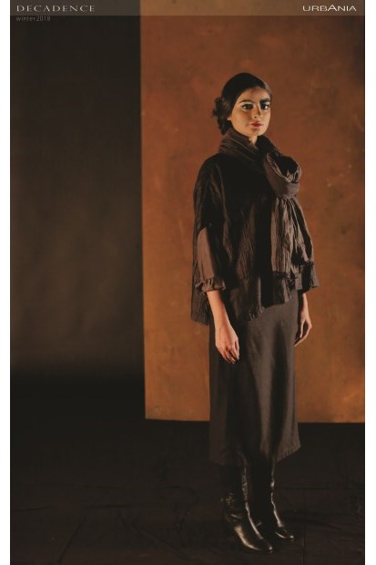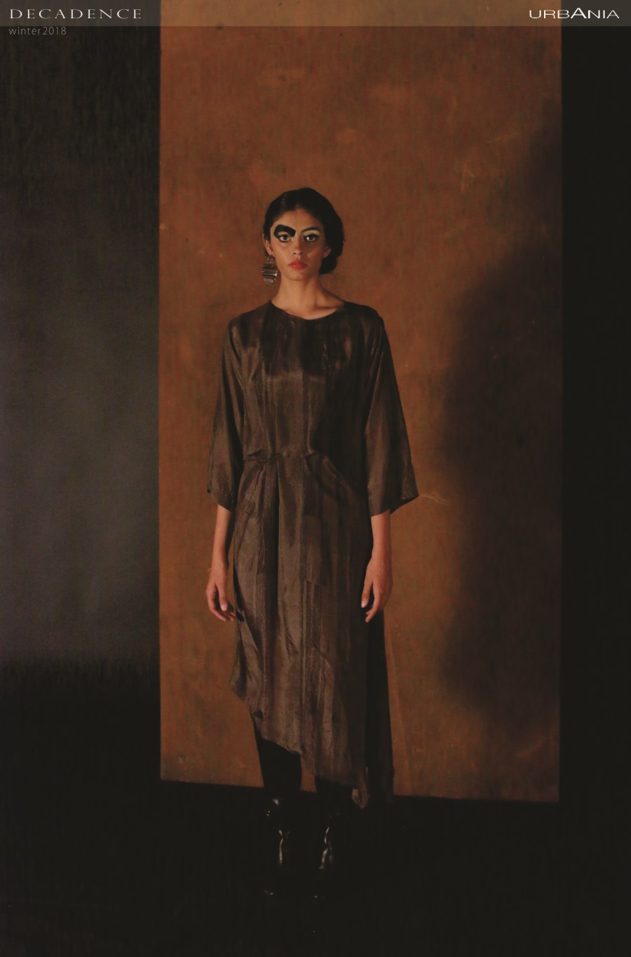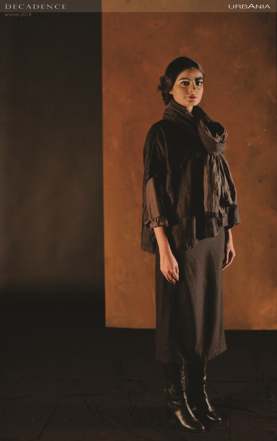 Enjoy the fluidity of handwoven silks layered in dark brooding colors of winter and the perfection of RUST staining and Syahi printing in the truest Wabi-Sabi traditions. Frayed and burnt edges combined with Ruching impart perfect decayed impermanence to this collection of shirts, dresses, overlays and jackets.