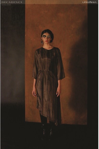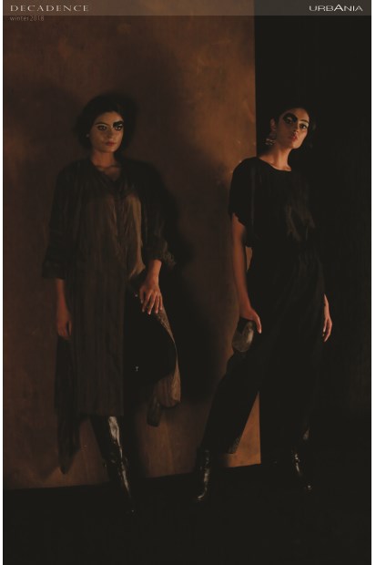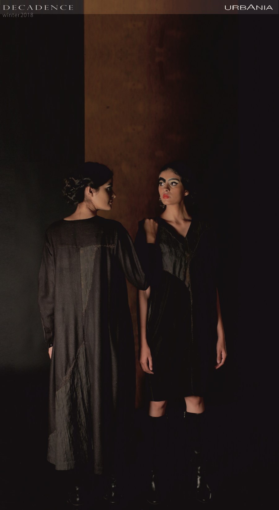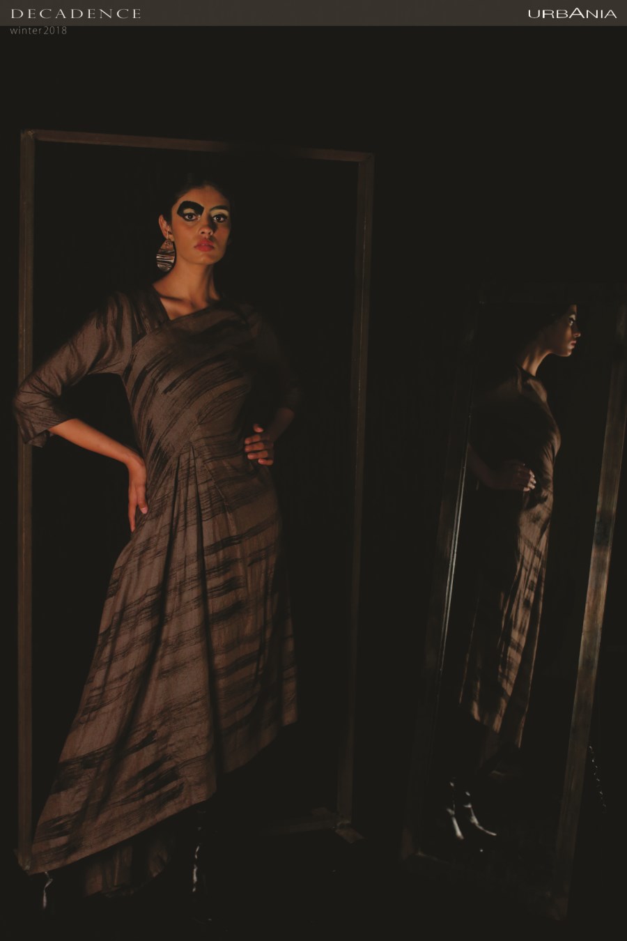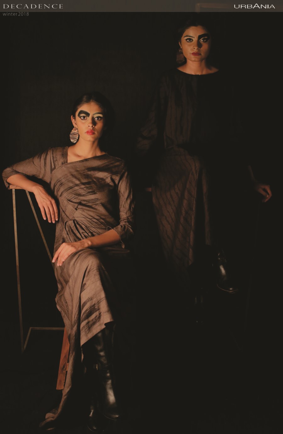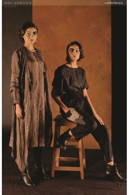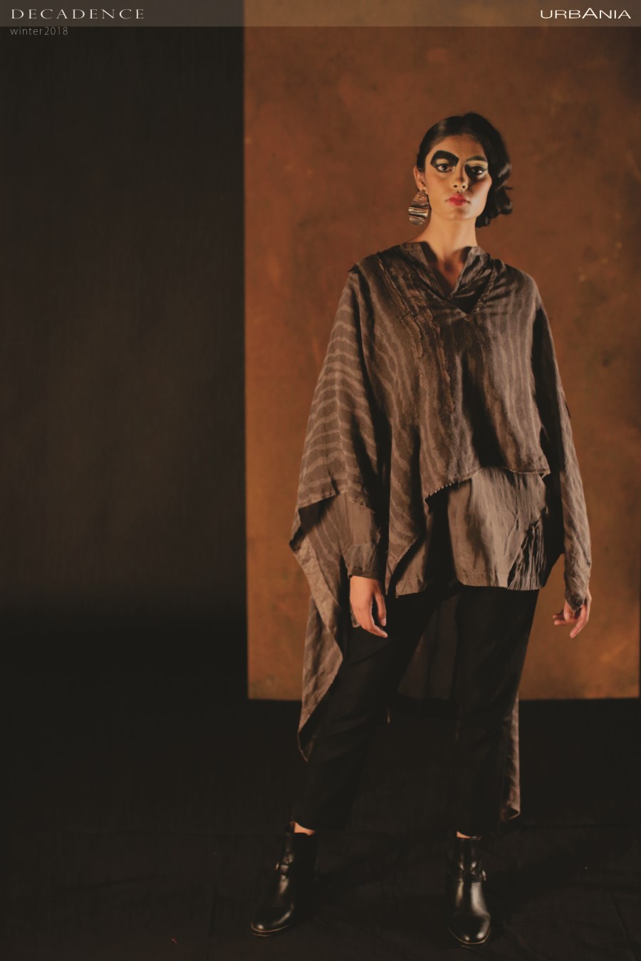 Enjoy the fluidity of handwoven silks layered in dark brooding colors of winter and the perfection of RUST staining and Syahi printing in the truest Wabi-Sabi traditions. Frayed and burnt edges combined with Ruching impart perfect decayed impermanence to this collection of shirts, dresses, overlays and jackets.