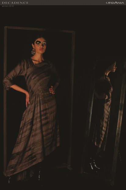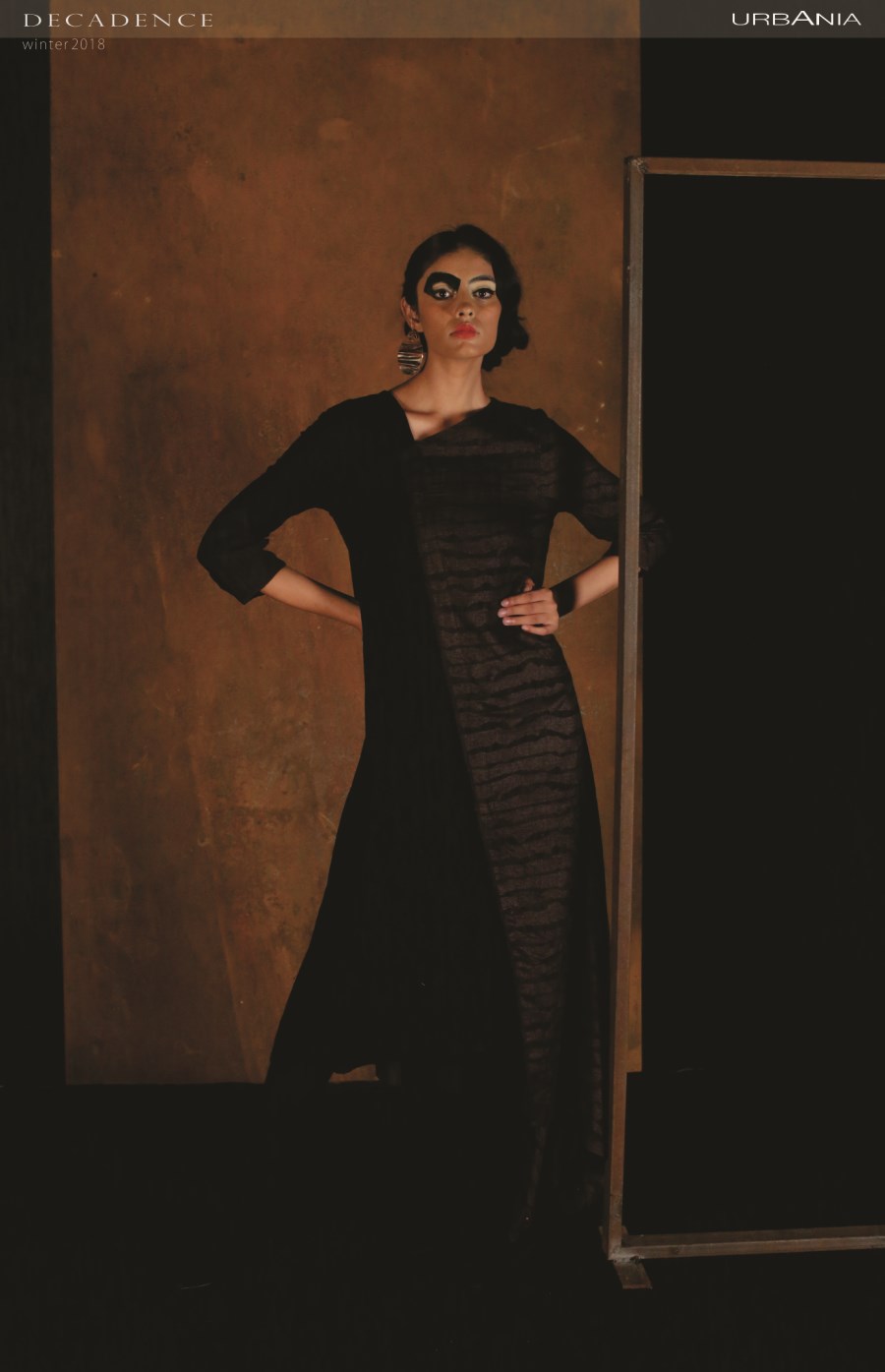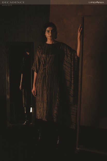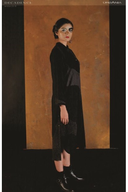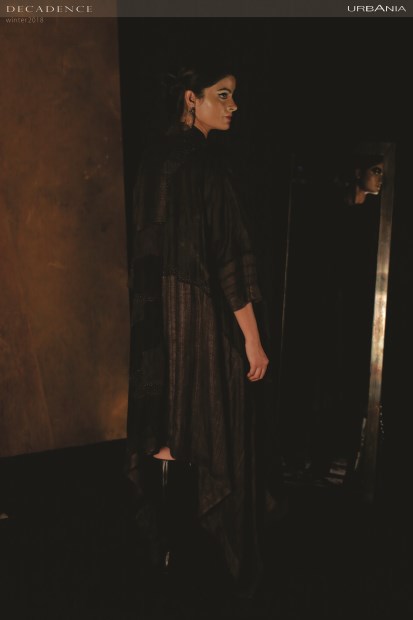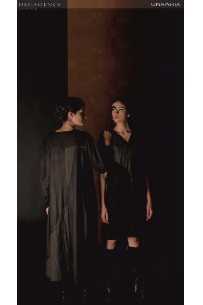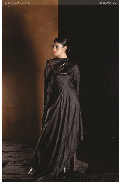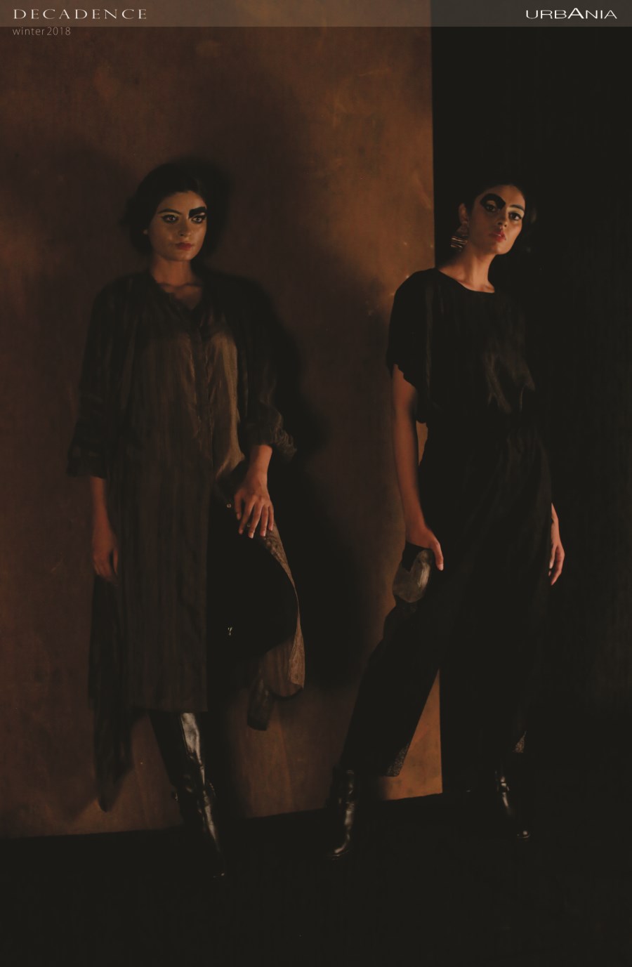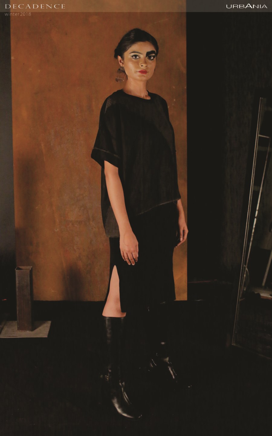 Enjoy the fluidity of handwoven silks layered in dark brooding colors of winter and the perfection of RUST staining and Syahi printing in the truest Wabi-Sabi traditions. Frayed and burnt edges combined with Ruching impart perfect decayed impermanence to this collection of shirts, dresses, overlays and jackets.