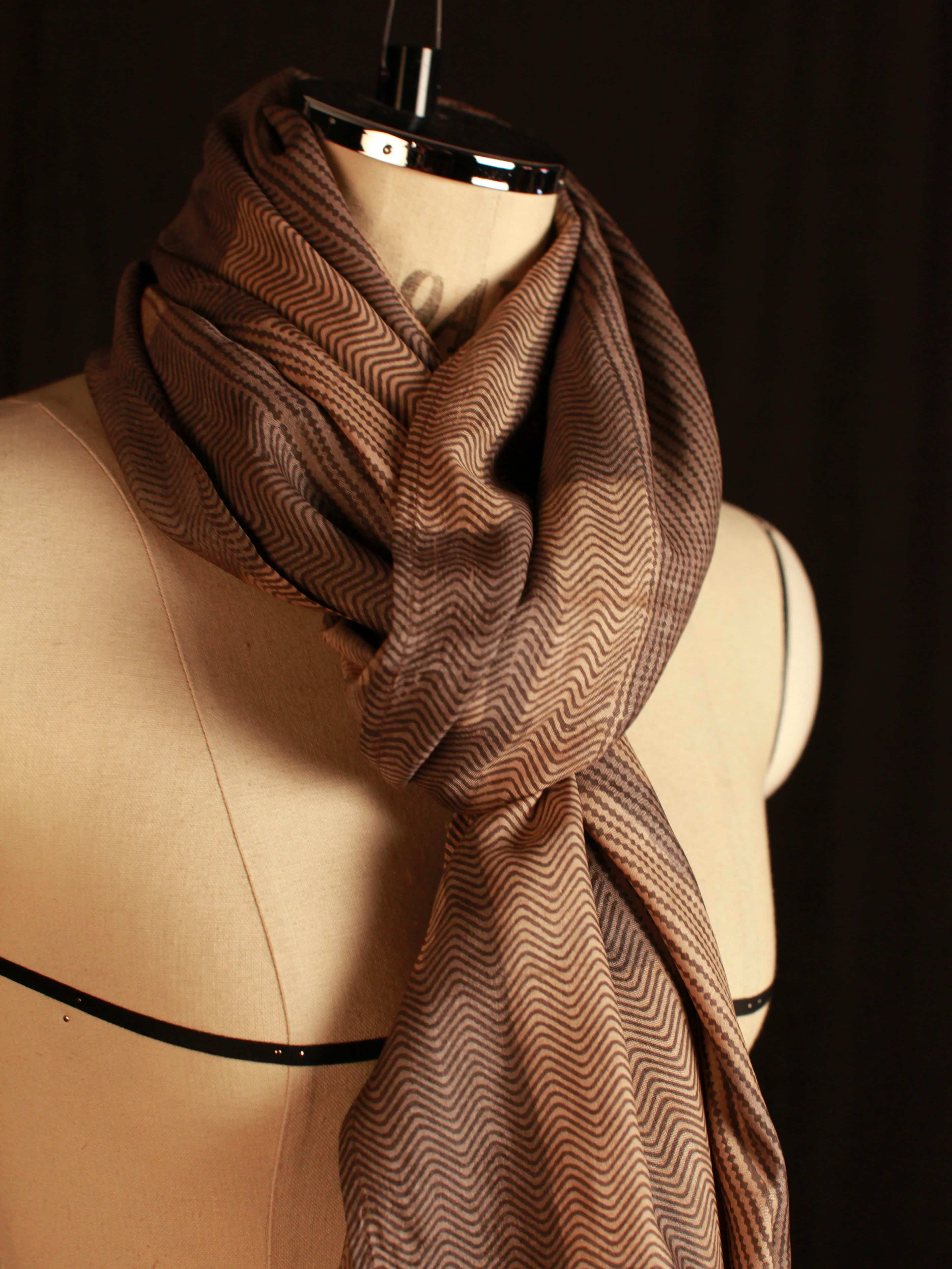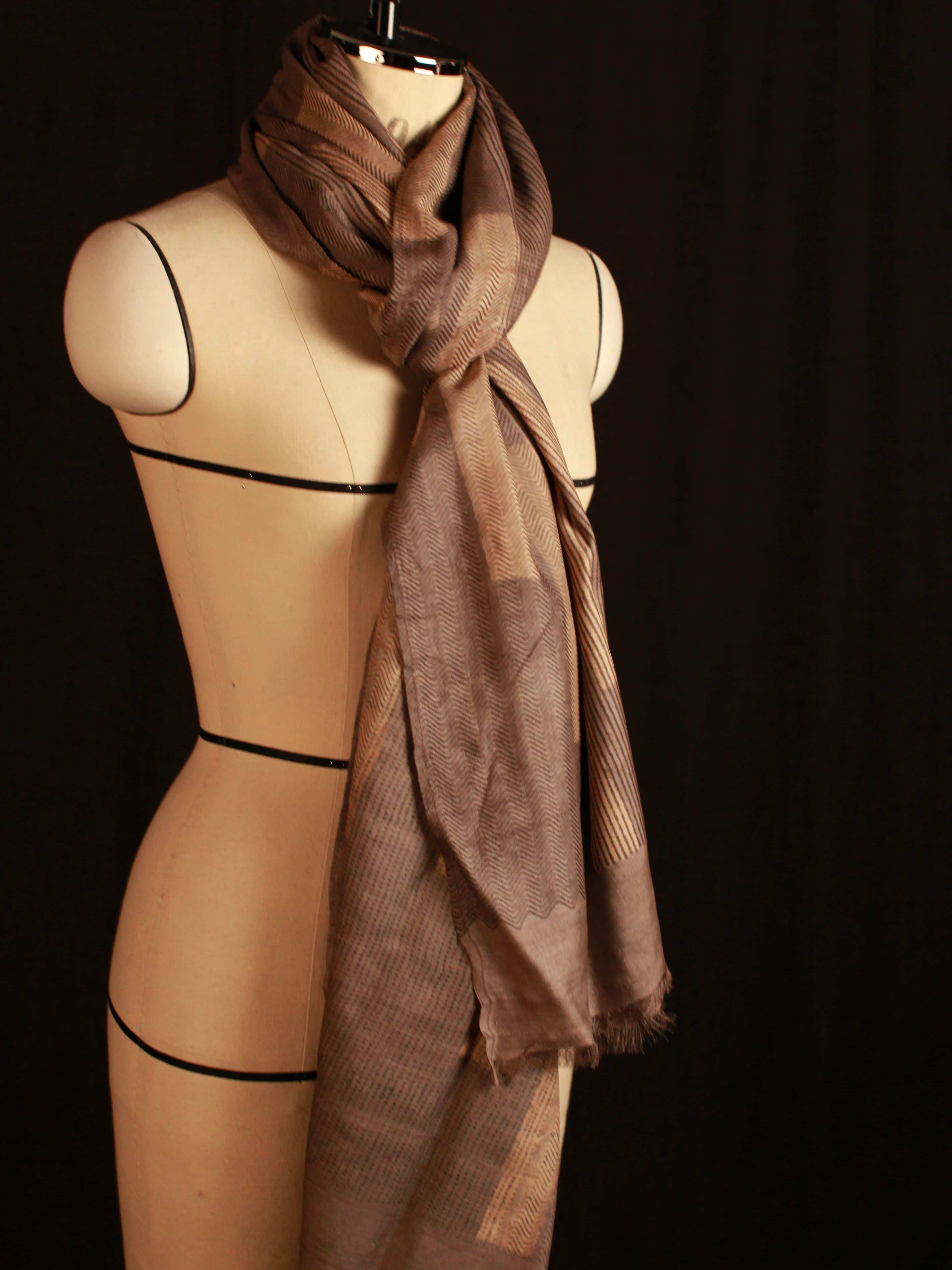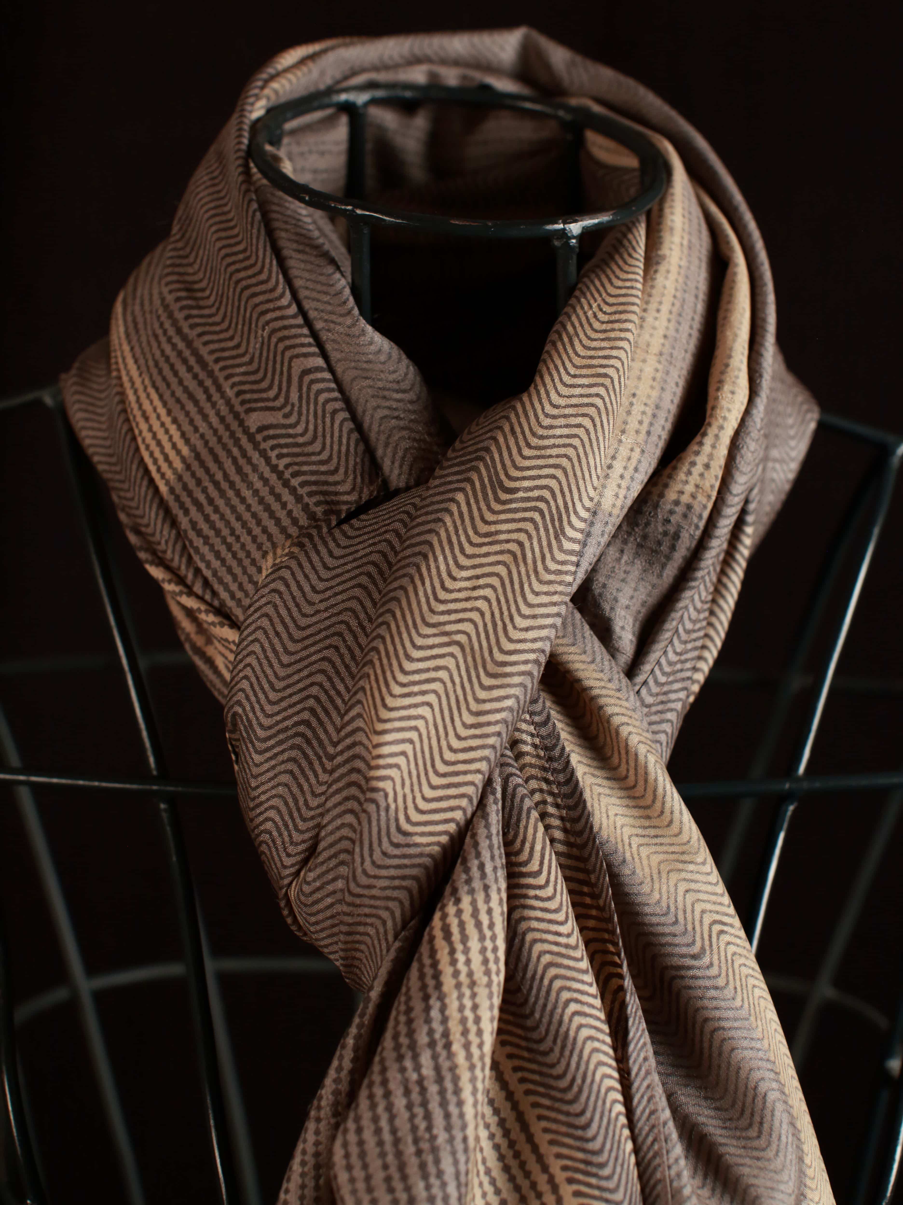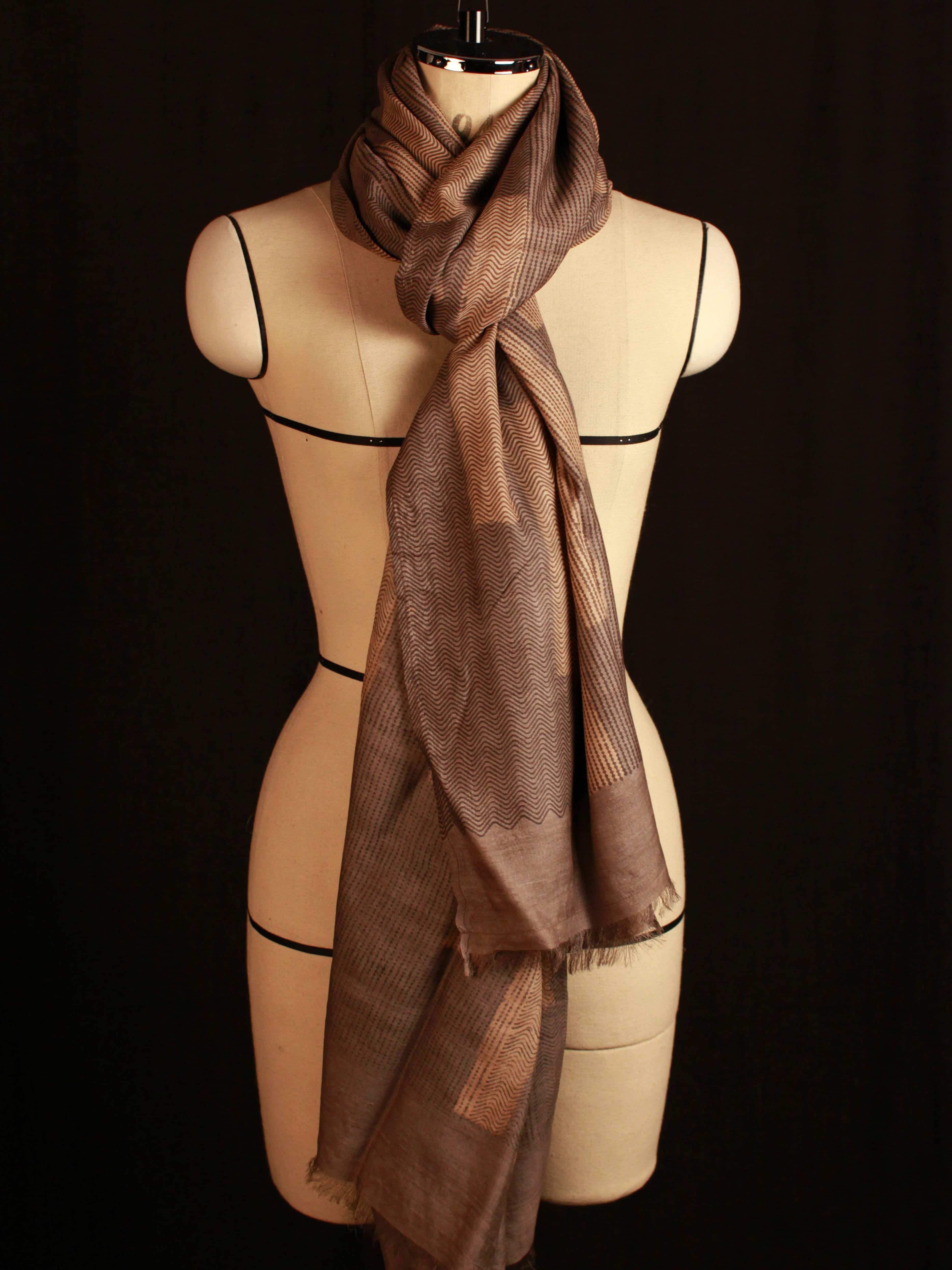 Another modern take on the classic chevron print - on handwoven Tussar Silk. The shades of grey from natural Kashish dye lend a timeless feel to the stole. Use it as duppatta or even a light shawl.