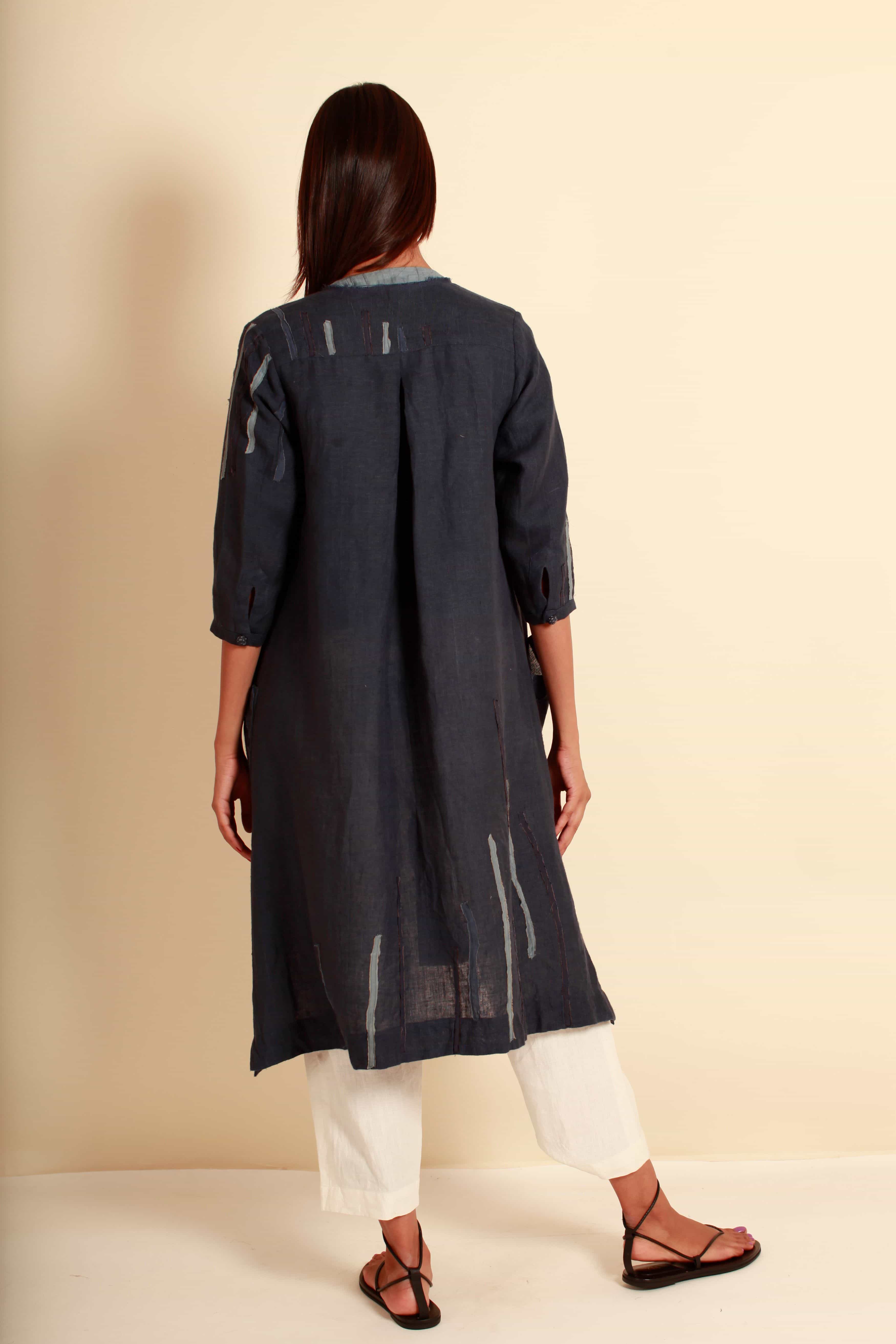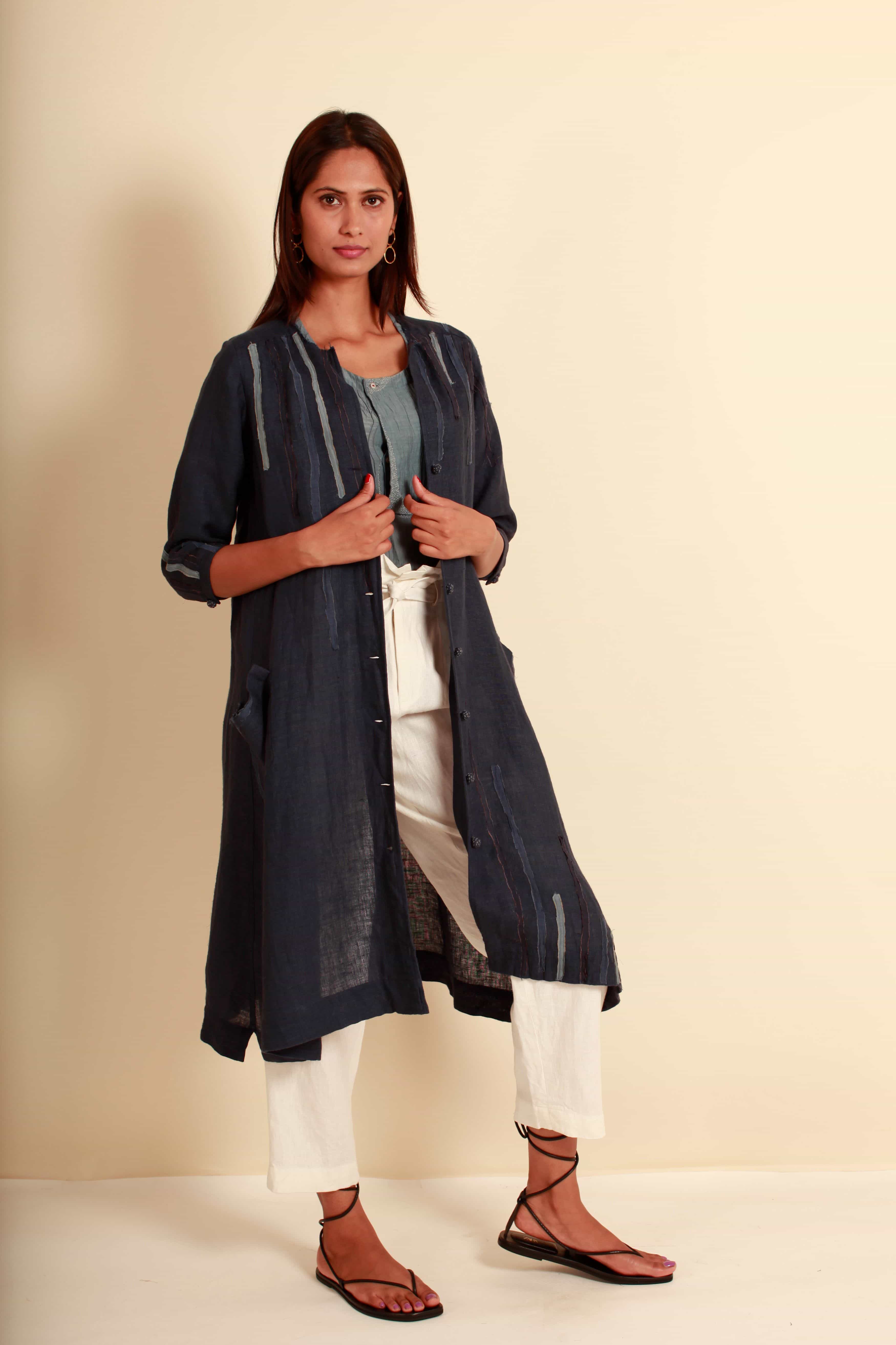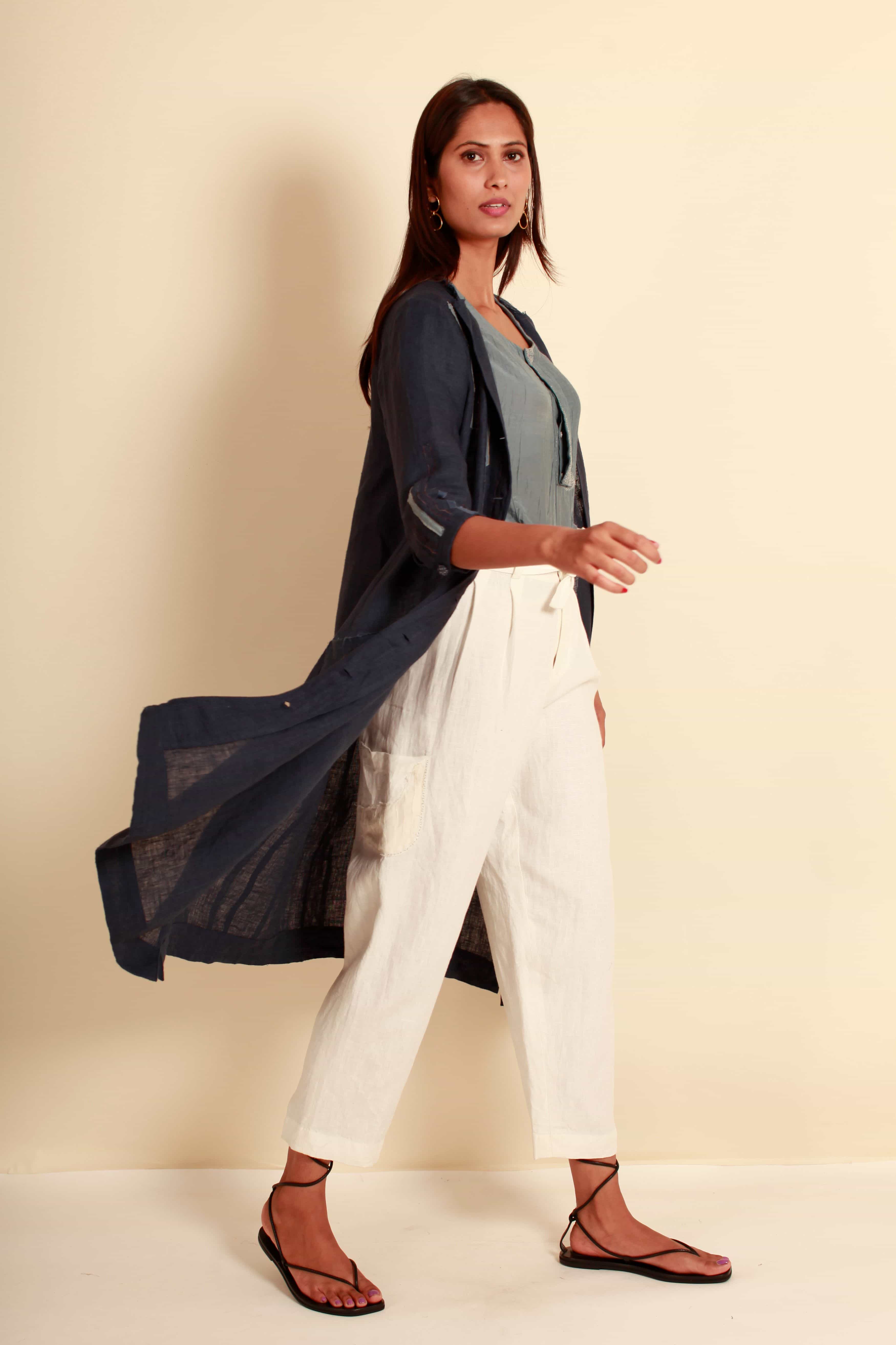 Versatile, button down, overlay in a soft Linen trapeze silhouette. Frayed and burnt edge finishing with a minimalist aesthetic make this ideal for casual day and evening wear. You can team it up with a day dress or casual pants.