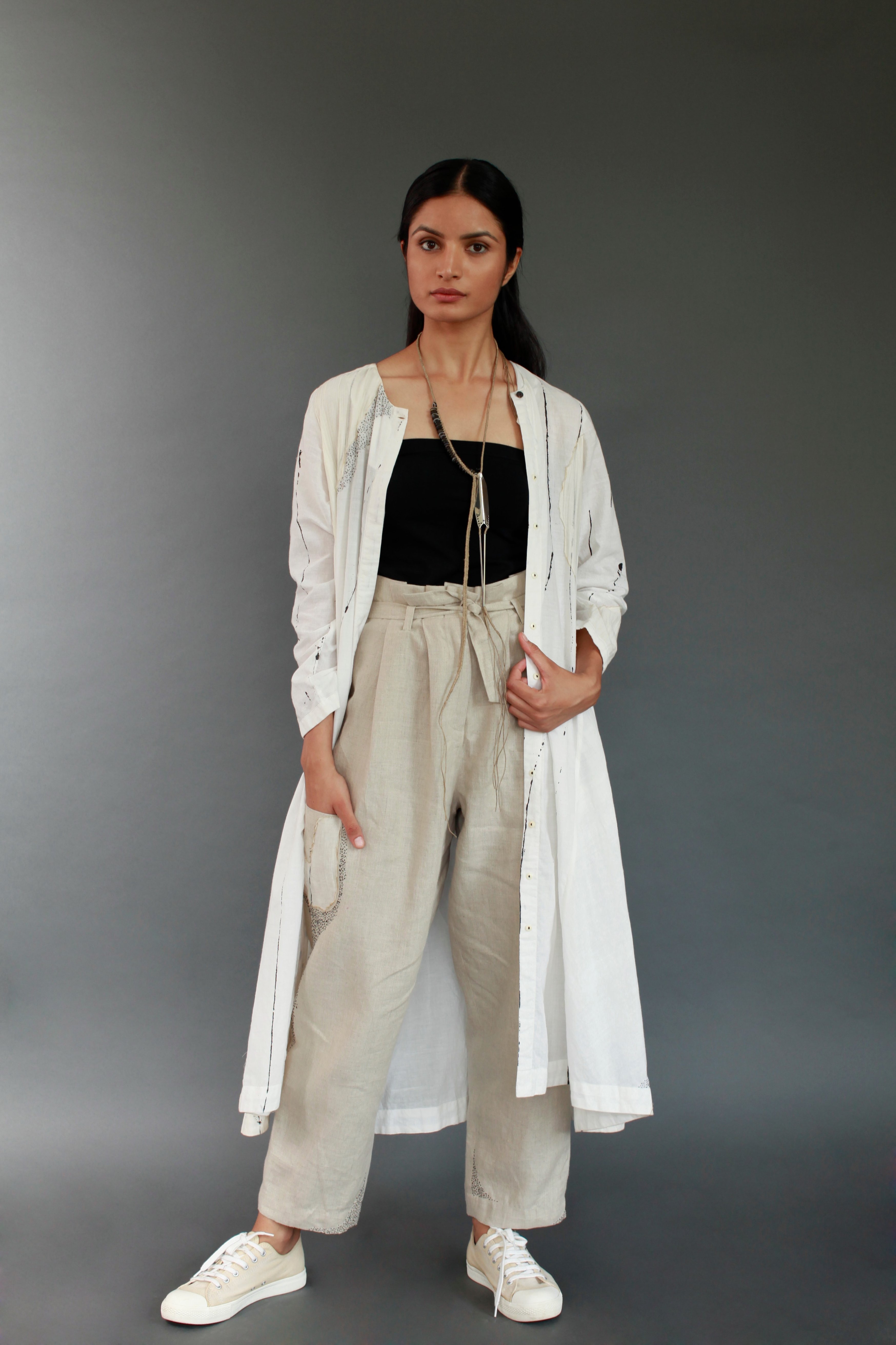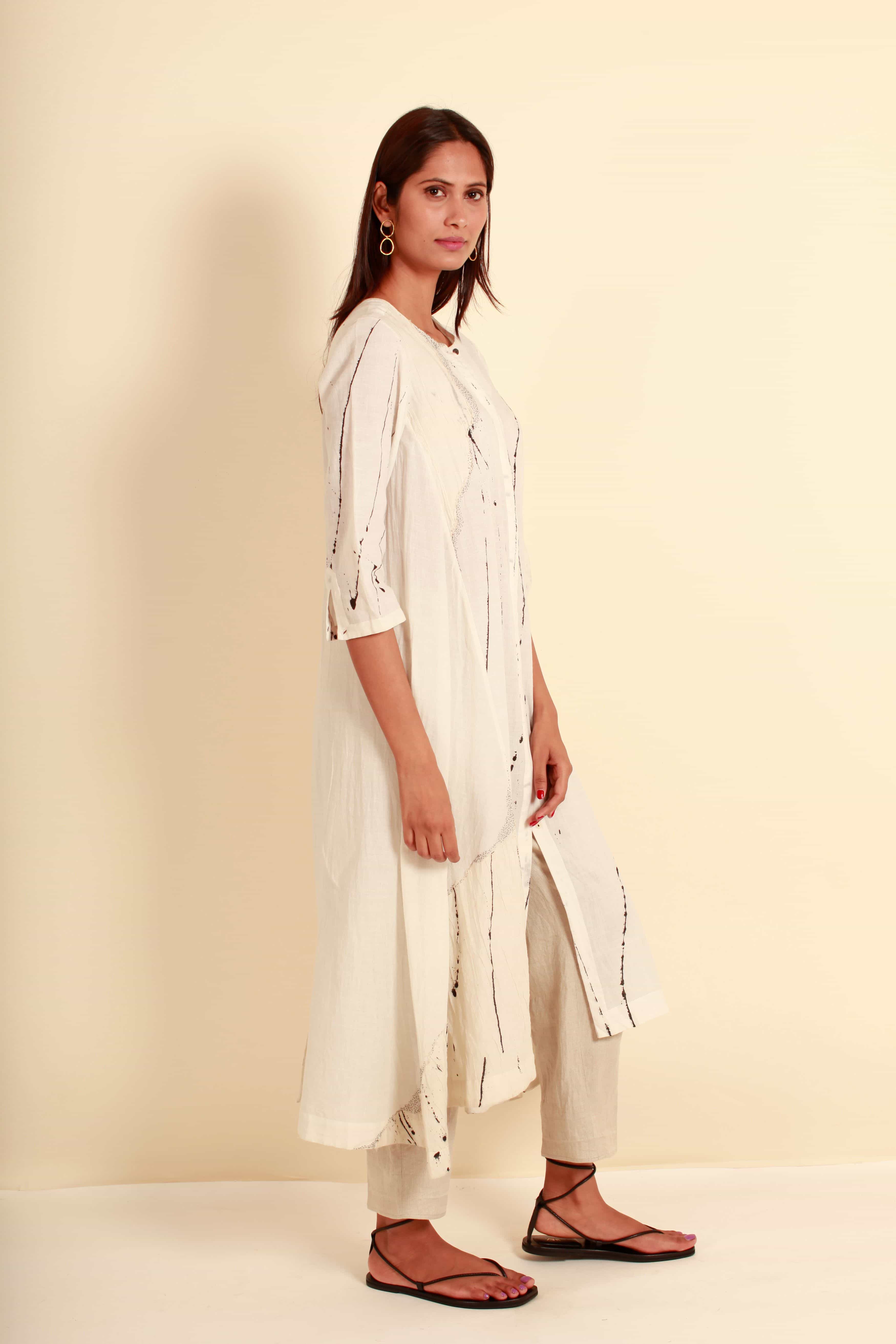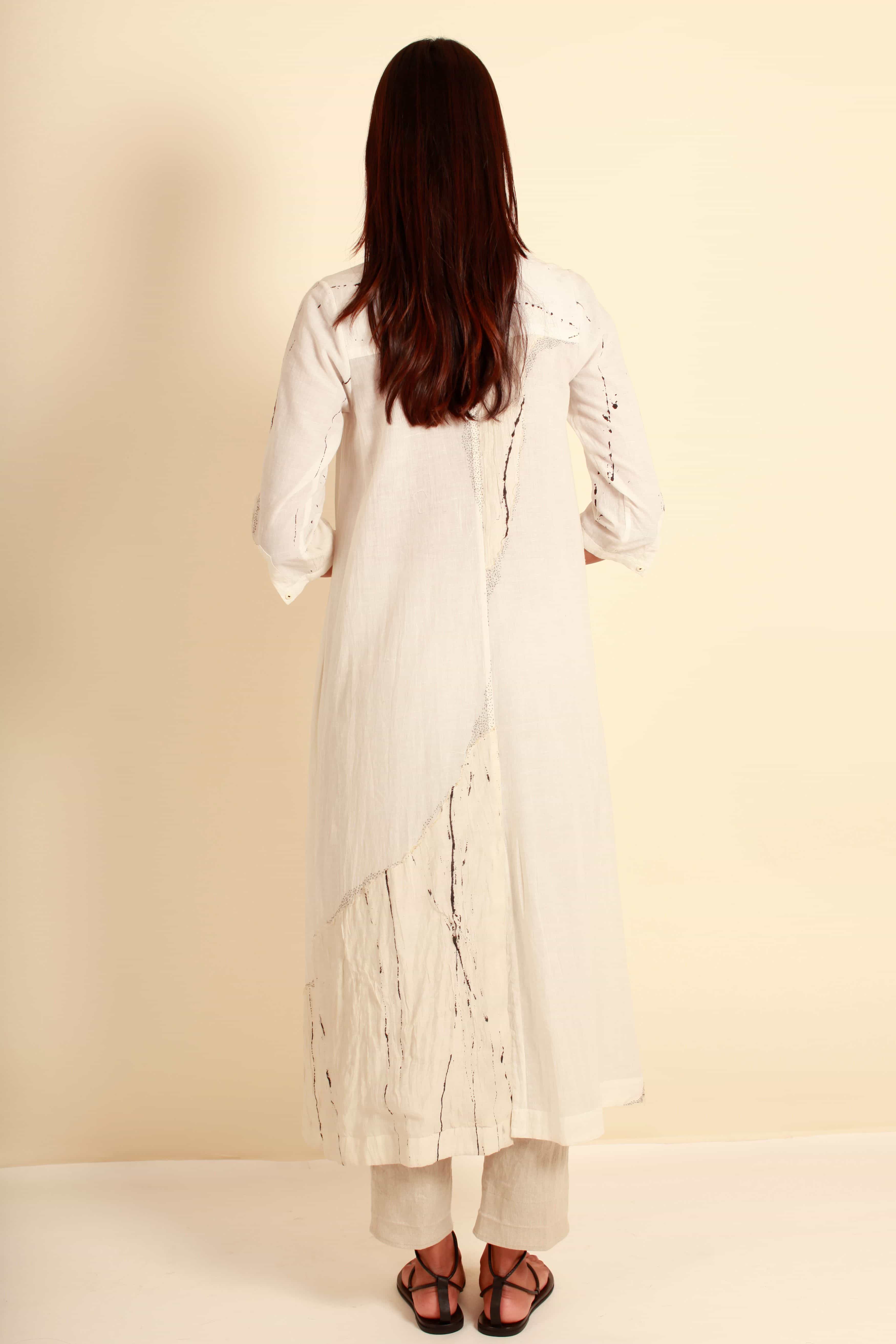 Versatile, Fit & Flare, Long khadi duster for the summer with our signature seeding stitch embroidery and sheer and ruched patches. Use as Kurta/Tunic or a Layering Piece.